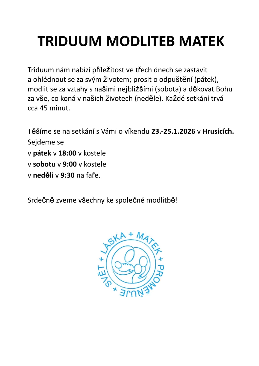 Následující víkend 23. až 25. ledna zve společné modlitební triduum, více na plakátcích nebo u paní Jitky Vaněčkové nebo Ludmily Topiarzové.